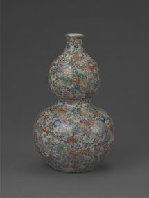 清乾隆是清代社会发展的鼎盛时期。景德镇御窑厂荟萃了一代名师巧匠,无论数量或质量都达到了历史的顶峰,百花不漏地装饰风格就是在乾隆盛世的产生的。此葫芦瓶造型线条十分俊美,曲张有度,在器里、器底均施松石绿彩,用粉彩分别绘菊花、荷叶、荷花、月季、牡丹等各色花卉,满布器身,俗称“百花不露地”。露胎处均描金彩,绘画技法精致入微,色彩绚丽多彩,为清乾隆时期精品之作,尤为珍贵。
