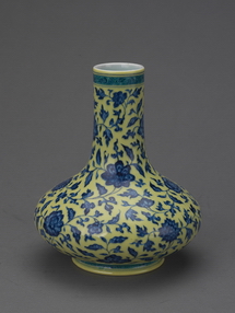 这种直口长颈,扁圆腹的瓶子俗称“荸荠瓶”,是清代流行的一种瓶式。康熙时首创,雍正官窑多有烧造,且形制规范。这件器物胎质洁白细腻,器内及外底施白釉,外壁施黄地青花缠枝花卉纹,有莲花、牡丹等,近口沿及圈足外墙各装饰青花卷草纹一周。这种雍正时期的黄地青花瓶非常稀少,从发表的资料看,全世界目前只发现两只。它们是先在瓷胎上以钴料绘花纹,施釉经高温烧成青花后,在白釉处加填柠檬黄釉,复入窑低温烧成。这件器物明显是仿明宣德时期的作品,青花浓艳稳定,黄釉娇嫩富丽,相得益彰。