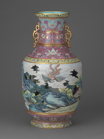 这件体型硕大的转心瓶倾注了督窑官唐英太多的心血和奇思妙想。它通体施丰富华丽的釉彩,代表了乾隆时期最标准的粉彩颜色。在腹部的外壁上,画师描绘了一只金光灿灿的凤凰翱翔于秀丽山水之上,而在内胆里则刻画了百余只不同种类的鸟禽仰首鸣叫,通过转动内胆,这些小鸟透过镂空的部分浮现在人们眼前,好似一幅热热闹闹的“百鸟朝凤图”。