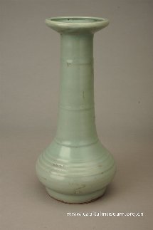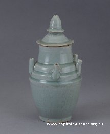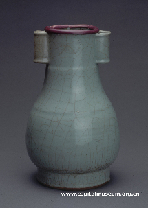 仿官窑贯耳瓶 明 首都博物馆藏 瓷器仿铜器是中国陶瓷艺术的一个传统题材,贯耳瓶是仿汉代青铜器投壶而制。南宋之后,龙泉窑应官家的需要生产仿官窑作品,可以推断出当时龙泉窑技艺水平已经与官窑相当。这件明代仿官窑贯耳瓶口部包金属扣,束颈,鼓腹,圈足略外撇,颈、肩部装饰弦纹两道,仍带有宋代遗风。 |