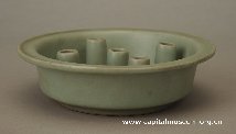 青釉洗式五管器 宋 四川省简阳市东溪镇园艺场宋墓出土 四川博物院藏 胎质灰白细腻,施粉青色厚釉,仅圈足足端无釉。据研究,有学者认为此“五管器”为一种灯具,南宋时龙泉窑出现的新器型。北宋时景德镇窑曾生产相似形制的多管灯,装饰华丽的莲瓣纹、花草纹,不同于龙泉窑同类产品的典雅沉静。 |
