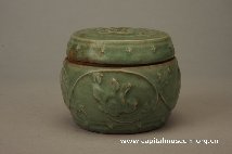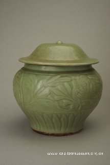 青釉花卉纹盖罐 明 四川省成都市前进机器厂出土 四川博物院藏 龙泉窑自南宋时期开始烧制这种丰肩弧腹的大型盖罐。元明时期这一传统被发扬光大,装饰技法推陈出新。元代盖罐多雕刻窄长仰莲瓣纹于罐体一周;明代罐盖主要分荷叶边和圆边两种,多用刻花或剔地刻花的手法表现牡丹、荷花、菊花等花卉图案,下腹刻窄瓣仰莲纹。 元明时期龙泉窑盖罐多为拼接底:底部无底,另置盘、洗状坯件架接于底部,上釉烧成时釉结为一体。 |