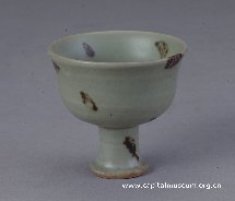 褐斑高足杯 元 首都博物馆藏 褐色点彩是元代龙泉窑流行的一种装饰手法。制作方法是用毛笔蘸取掺有紫金土或其它高含铁量原料的彩料点画在青釉上,烧成后呈褐色,与青釉交相辉映,别有一番风味。 |