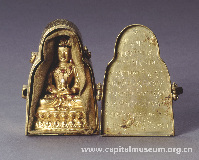发现于楠木佛经函内。外为铜镀金嘎乌,呈凸字形,内外满刻藏文《尊胜咒》。内奉赤金长寿佛一尊。长寿佛结跏趺端坐,全身镶嵌44颗红宝石,做工精细,形象庄严。 |