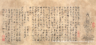 经折装,首尾以织锦装裱,外套织锦经夹。经前为鱼篮观音画像。经文采用唐玄奘大师译本,共260字。书体以行楷为主,兼有草书,书写工整,笔力遒劲。经尾附有乾隆皇帝题跋。全经还有乾隆皇帝四方印章。 |