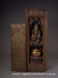 由整块黄檀木雕刻而成,正面镶嵌一块彩绘木盖,木盖外面彩绘哼哈二将,内面竖行墨书观音偈:“念彼观音力,能救世间苦;愿以此功德,众生同得渡。”龛内上方雕观音菩萨坐像,下方置木质圆盒,盒内奉有舍利子等圣物。选料上乘,工艺精细,显示了清代皇家艺术的高贵品质。 |