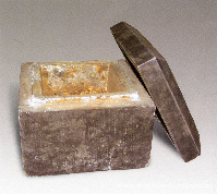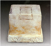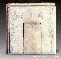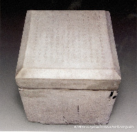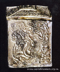 雕刻于隋大业十二年(616年),长宽各3.85厘米,高5厘米。函身四侧面刻忍冬纹及青龙、白虎、朱雀、玄武四灵图像,造型小巧,刻工精美。函内有木质彩绘香珠1颗、珍珠8粒。 |