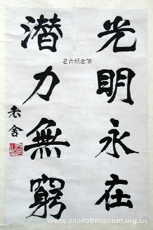 老舍(1899-1966),原名舒庆春,字舍予,满族,作家,戏剧家。代表作有《离婚》、《骆驼祥子》、《四世同堂》、《茶馆》等。1951年因创作剧本《龙须沟》被授予“人民艺术家”称号。老舍辛勤写作,为新中国文化事业的繁荣发展贡献了自己的一生,他曾被选举为全国文联副主席、北京市文联主席,并曾多次被选为北京市人大代表、全国人大代表、全国政协委员。老舍先生,除了写小说和剧本之外,是个书法家,还是个美术评论家和美术收藏家。他的字很漂亮,有点魏碑味道的楷书,自创一格。他一生留下了不少幅书法作品,绝大部分都在朋友们手中。书法作品里的词都是他自编的,或是诗,或是一段有趣的话,还特别标明请朋友们“两政”。