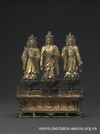 这是一组佛教净土宗崇奉的造像题材,中央主尊为阿弥陀佛,主尊左为观音菩萨,右为大势至菩萨,合称“西方三圣”。三尊像皆立于仰莲座上,各结不同的手印显示各自不同的宗教功用和身份。像下台座做成池塘形式,四周雕以护栏,池中水波荡漾,并生出三枝莲茎。其创意来源于《阿弥陀经》宣称的“七宝池,八功德水”的记载。 |