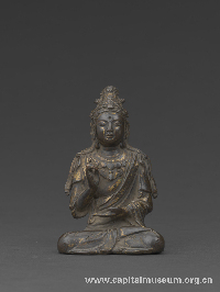 此像头梳高发髻,发髻正面安有化佛阿弥陀佛,面相饱满圆润,富有肌肉感,神态庄严肃穆。耳边各有一条发辫垂至肩部,并在肩部分段打结。身着袒右肩袈裟,胸前缀饰璎珞,衣纹写实,质感强烈。跏趺端坐,右手当胸持杨柳枝(已失),左手托净瓶(已失)。造型样式及表现手法具有鲜明时代特点。 |