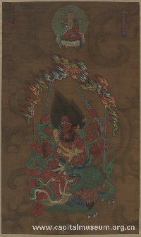 马头观音又称马头明王,是密宗所奉“六观音”之一,主司畜生道的救度和教化。此画中观音张口呲牙,三目圆鼓,全身火红色,身后燃起熊熊火焰,形象凶忿。有三面六臂,正面头顶有一“种子”字,左三手分别持剑、箭和蛇,右三手分别持杵、弓和如意。身披帛带,项挂珠链,骑坐青狮之上。顶有观音菩萨圣像,手持如意,安坐于白色莲座上。背景绘祥云,疏朗浅淡。右上角榜题“大威德马首明王”,左上角有“大明万历乙酉年已慈圣皇太后绘造”款并印。 |
