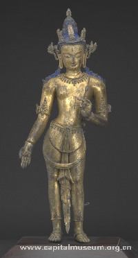 此像头戴三花冠,头顶结高发髻,耳边扇形冠结横出,并有U形宝缯翻卷,余发垂肩。面形长圆,额间饰方形白毫。上身袒露,脖颈挂项圈、璎珞,左肩斜披连珠式圣带,下身围薄裙,两腿间有密褶式垂带,四肢还有钏镯装饰。三折枝式站立,躯体运转自如,肌肉饱满而富有弹性。左手当胸,右手下垂结施与印。体态优美,形象庄严,体现了印度帕拉艺术鲜明特点。 |