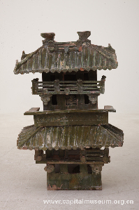 绿釉陶楼 东汉 北京市丰台区黄土岗汉墓 首都博物馆藏 泥质红陶,楼体分为两截,实为四层,墓葬随葬的明器。这一时期,北京虽为军事重镇,但各种经济也有长足的发展。这件陶楼器形高大而复杂,显示出当地先进的制陶技术,与同一时期其他中原腹地出土的陶楼相比,毫不逊色。另一方面,陶楼典型的建筑形制,也是汉代古典建筑风格的重要体现。 |