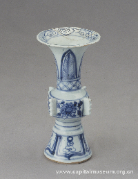 景德镇窑青花蕉叶纹觚 元代 北京市西城区新街口出土 首都博物馆藏 西域引进的钴原料和伊斯兰工匠带来的青花工艺,正迎合了尚白尚青的蒙古人的喜好,由此开创了中国制瓷工艺史上一个新的种类——青花瓷。与此同时,其造型摹仿商周礼器,是当时复古的突出实例。青花瓷以中国传统瓷器造型、图案配以伊斯兰风格的装饰细节,将多民族的文化融于一身。 |