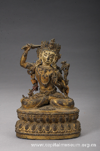 铜鎏金文殊菩萨像 明永乐 首都博物馆藏 明时,统治者为了加强对西藏的统治和联系,加之自身对于藏传佛教的信仰与推崇,北京成为藏传佛教在内地传播的中心。在帝王的扶持下,藏传佛教艺术不断兴盛。宫廷佛教造像开始于明永乐皇帝,在保留藏传成熟艺术的基础上,融合汉地的审美观念及表现手法,是汉藏文化交流的艺术成果。 |