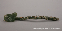 青玉灵芝如意 清代 北京市密云县董各庄清皇子墓出土 首都博物馆藏 碧玉质,有土锈,如意头做灵芝形,上雕一蝙蝠,如意柄上雕有灵芝及蟠桃,寓“福寿”之吉祥意。 |