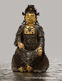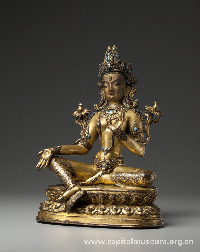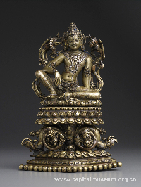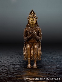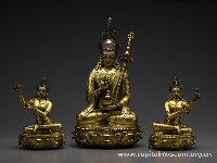 莲花生及其明妃 喀尔喀蒙古 十七世纪晚期至十八世纪早期 高41厘米、22厘米、22厘米 红铜鎏金 莲花生大师也被称为“古如上师”,也即“宝上师”。这尊佛像中,上师以跏趺坐端坐于圆形莲座,身着精美僧袍、斗篷,背部、靴部折痕清晰,饰有金耳环和臂环。右手持金刚杵,左手托嘎巴拉碗置于腿上,碗内盛长寿瓶。一根描绘过的华丽骷髅杖立于佛像左肩。脸部和手部鎏金,发涂蓝色,嘴和眼经过绘制,看上去栩栩如生。头戴萨霍尔莲花帽,两边帽翼突起,帽子正中有太阳和新月图案,帽顶是半截金刚杵及一根鹰羽造型。帽上有红、黑、白、绿四色。传说莲花生大师是印度西北乌仗那人士,由藏王赤松德赞请至藏地,一路上降妖除魔,使他们皈依佛法。约790年,在藏王帮助下,莲花生大师建起了桑耶寺。他的无边圣力和对密宗经典的传教,使他在藏传佛教中具有极大影响。佛像左右两侧各有两尊女性造像,是藏王妃益西措杰和印度公主曼达拉娃。莲花生大师有很多明妃,这两个最为重要。两明妃都以半跏趺姿势坐于圆形莲座。益西措杰左手供奉宝瓶,曼达拉娃右手供奉嘎巴拉碗。两个明妃丰腴动人的身体分别向左、向右倾斜,与扎那巴扎尔所塑度母像不同。他们缠腰布,着披肩,松软地垂于大腿,绕过后背和基座,饰以繁复的珠宝——皇冠、耳环、项链、臂环、足链、腰带,足部、手部、脸部鎏金,眼睛、嘴唇着色。蓝色的头发一半绾成发髻,顶部用珠宝装饰,另一半自然披散于后背和肩部。跟莲花生大师的造像一样,这两尊塑像也用奉献板密封,板上鎏金金刚杵呈十字交叉,这是扎那巴扎尔风格塑像的典型特征。 |
