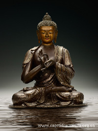 燃灯佛 汉藏风格 清乾隆 高50厘米 合金铜 局部冷金 错银 从清宫造办处造办佛像、法器的整个流程来看,宫中的造佛机构实际上是由两部分组成,即中正殿和造办处。作为佛像的尊像与法器的铸造和加工,其宗教意义是最为重要的,所以喇嘛的参与是十分重要,这就是中正殿的作用,其次才是由造办处各作完成的纯技术加工。 中正殿喇嘛工匠与造办处工匠在成造藏传佛教尊像时有着得天独厚的优势,他们可以接触到宫中大量新旧的“番”、“梵”造像,从中吸取营养成分;他们还可以直接接触到西藏、尼泊尔和蒙古来的优秀工匠,学习与交流技艺。更为重要的是宫中传统的高技术工艺水平的充足的资金来源,为藏传佛教造像的模仿和创新提供了技术和物质保证,所以清宫的作品与西藏相比,加工技术水平较高,宫中造像、法器细部加工光滑细腻、纹饰华丽精美,与西藏造像的粗犷简陋有明显的区别,宫中造像常选用名贵金属材料铸造和镶嵌,并装饰各类珠宝,以增加其豪华的效果,更显皇家特色。乾隆时期宫中藏传佛教艺术的繁荣离不开中正殿工匠喇嘛和造办处工匠的努力和智慧。 宫廷成造的这些法器和佛像主要用于宗教目的,其宗教性是第一位的,其次才是他们的艺术性,乾隆帝对于佛像、法器的审美要求并不是很高,更重视的是它们宗教意义的阐发和对古德先贤的追思。 通常人们习惯将此像定名为释迦牟尼佛,但考虑到他双手施转法轮印,不如称为“燃灯佛”更准确。燃灯佛因其出生时身边一切光明如灯而得名。 精彩的是其身上嵌银的花纹装饰,衣边领口嵌卍字不到头纹样,寓意万福无疆;袈裟上饰卷曲妙曼的缠枝花纹,加之沉郁的古铜色,袈裟宛如绫罗锦段织就,使佛陀显得更加华贵而庄严。 |