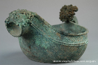 上鄀(ruò)大子平侯铜匜(yí) 春秋(公元前770-公元前476年) 河南省南阳市夏响铺鄂国贵族墓地出土 南阳市博物馆藏 鄀国有上鄀、下鄀之分。上鄀在今湖北宜城市东南,都城商密。春秋时迁到河南省淅川南边内乡县境,称为下鄀,后灭于楚。此匜器内底铸铭文“上鄀大子平侯作盥匜,子子孙孙永宝用”,为研究鄀国历史及与鄂国、楚国的关系提供了珍贵的实物资料。 |