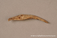 骨雕鹰首 新石器时代 黑龙江省密山市新开流遗址出土 黑龙江省博物馆藏 在渔猎经济占重要地位的远古时期,猎鹰海东青在肃慎先民生活中扮演着重要角色。此件骨雕,鹰首为顺骨棒走势雕琢而成,长喙圆眼,似在引颈凌空飞翔,手法简练,生动传神。这件以海东青为艺术形象的艺术品,也是判定新开流文化为肃慎先民所创造的重要依据。 |
