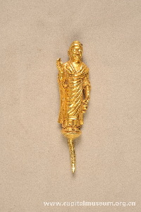金佛 唐渤海(698—926) 黑龙江省宁安市渤海上京龙泉府遗址出土 黑龙江省博物馆藏 佛像上身穿半披式袈裟,左手提净水瓶,整体形象端庄恬静,极具神韵。以往唐代佛像袈裟的样式,大多是自然敞开下垂的,因此佛像的胸部和腹部多是袒露的,而这尊小金佛全身的服饰穿戴齐整,这在唐代佛像中并不多见。该尊小金佛也是目前在渤海国上京龙泉府遗址内发现的唯一一尊纯金佛像,具有极为重要的历史研究价值。 |