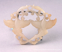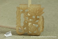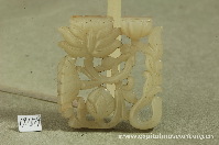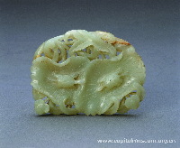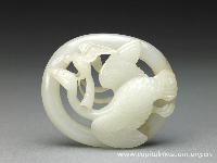 透雕双鹤衔草纹玉饰 金(1115—1234年) 北京市房山区长沟峪乡金墓出土 首都博物馆藏 扁平体,略作椭圆形。正面以透雕加阴线刻出一对比翼双飞的仙鹤。仙鹤口衔灵芝。嘴尖相对,两腿合并且交叉在一起,左右对称。饰件正中顶部有镂空的穿孔。背面光素留有琢磨痕迹。金代玉雕,多以花草为背景,构图讲求左右或上下对称,雕琢技法多样,具有很强的立体透视感。 |