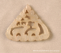 双鹿纹玉佩 金(1115—1234年) 黑龙江省绥滨县 奥里米金墓出土 黑龙江省博物馆藏 此即秋山玉。秋山玉是指以山林、虎、鹿、熊为主题的玉器,辅以山石、灵芝和柞树等,虎多作伏卧状,鹿多作回首、站立、奔跑状。 佩饰由和田白玉精雕而成,玉质透明温润,略呈三角形,造型精巧别致,构图清新典雅。底部两棵随风摇曳的树构成三角形状,树下站立两只马鹿,左侧公鹿引颈长鸣,体态健美;右侧母鹿回眸凝望公鹿,神情亲昵。两鹿上方,有一只大雁盘旋低回,振翅翱翔,似欲南归。该玉雕具有浓郁的地方特色和民族风格。 |