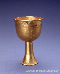錾花高足金杯 金(1115—1234年) 北京市西城区月坛南街出土 首都博物馆藏 金国旧俗,“饮客佳酒,则以金银器贮之”。金代金银器,从工艺和文化上来看,是在大唐余韵和宋辽的直接影响下,形成了具有自身特色的金银器风格,并处于北方草原金银器发展的鼎盛时期,后为元代所继承和模仿。金质高足杯为饮酒器皿,最早出现于隋代李静训墓中,唐代窖藏之中也有出现。据相关研究成果表明,这种器形很可能是受到西亚和地中海地区的影响而产生的。这件金质高足杯形态修长,口沿下端和圈足上端分别錾刻一周卷草纹,相互呼应,杯腹三个开光内各錾一朵海石榴花,并錾出地纹以增强主体纹饰的立体感和真实性。 |