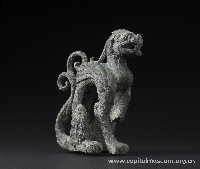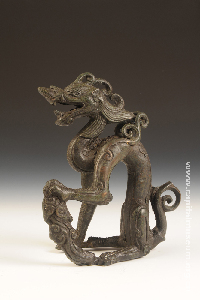 铜坐龙 金(1115—1234年) 黑龙江省哈尔滨市阿城区白城金上京会宁府遗址出土 黑龙江省博物馆藏 龙呈踞坐式,为铜铸造而成。坐龙昂首张口似吟,肩微前弓,前左腿翘起,右前腿略向前方直立,龙尾上翘向外卷曲。龙首、肩部和四肢饰有卷鬣。形象逼真,栩栩如生。应为金代皇室御用之物。 |