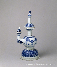 青花璎珞纹贲巴壶 清(1644—1911年) 故宫博物院藏 器形仿藏族银制贲巴壶形式烧制,造型略如塔形,口流均有盖,新颖别致。壶口直近颈部,流曲折连于圆形腹部,下承覆钵体相托,底足内素白,无款识。通体以青花装饰,白色乳钉纹、腹部的兽面璎珞纹使贲巴壶更显精巧华贵。 贲巴壶是藏族寺院的祭神用品,清代皇家御窑厂多烧制此类型壶,作为清朝皇帝向西藏、青海等地的宗教领袖赏赐之物,以笼络人心,巩固统治。这件青花璎珞纹贲巴壶,即少数民族地区传统的造型纹饰与汉族悠久的陶瓷烧造工艺完美的融合,是多民族文化交流的历史见证。 |