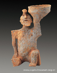陶胡人俑座灯 西汉(公元前202年—公元9年) 盏口径8厘米、灯座宽16.6厘米、通高22.8厘米 1999年广州市先烈南路大宝岗M5出土 广州市文物考古研究所藏 此俑眼睛细长,高鼻梁,连腮胡,头发束于脑后折向前成髻,是来自海外的男性家奴造型。这种胡人俑座灯,常见于岭南地区的汉墓,最早出现于西汉中期。裸体,面目体型似为东非人,被贩卖到东南亚,汉代到达岭南。广州汉墓出土的俑座灯位于主人棺具的前后处,很可能是汉代达官富人来自海外的家奴的形象,为其主人掌灯。 |