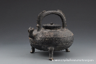云雷纹兽首提梁黑陶盉 东周 陶 通高19.8厘米,口径7.2厘米,足高5厘米,重1.57千克 1979年贵溪渔塘水岩出土 江西省博物馆藏 这件黑陶盉仿自外形相似的青铜盉。它的表面乌黑发亮,是仿铜器之珍品。 盉本为商周青铜器中的酒器。像这样腹部扁圆,带有兽首提梁的青铜盉流行于春秋晚期到战国时期的中原和两湖地区。 |