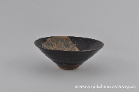 吉州窑黑釉木叶纹碗 宋代 瓷 高5.5厘米,口径14.8厘米,足径3.8厘米 1962年江西省南昌市文物店收购 江西省博物馆藏 吉州窑是南宋到元代以生产民间日用陶瓷为主的民窑。木叶贴花是吉州窑独创的一种典型的黑釉瓷装饰,是将天然树叶浸水腐蚀后留存叶脉,然后贴在已施黑釉的器物上,再敷透明黄釉经高温烧制而成,树叶的形状、叶脉清晰可见,多用于装饰碗的内壁。如果注上茶水,眼睛和茶盏口保持水平,就会看到树叶仿佛在水中漂浮,别有一番情趣。 是什么情况启发陶工在釉上装饰树叶呢?这个问题已很难找到确切答案,或许某个陶工在生产时没有发现釉面上落了树叶,等产品出窑后却发现这片树叶已然与瓷器融为一体,极具自然美,于是他将错就错,研发出了这种特别的瓷器装饰方法。 |