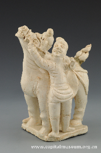 青白釉牵马俑 北宋 瓷 高21.9厘米,底长11.5厘米,底宽10.1厘米,重2.12千克 1970年江西省景德镇市郊新平公社洋湖大队出土 江西省博物馆藏 这件胡人牵马俑为手工成型。在昂首、龇牙、翘尾的马两侧,各塑有一尊圆目、高鼻、发髻高挽、脚蹬长靴、身着短袖褂的胡人。其中一名胡人伸手作牵引状,马背上马鞍绳套齐全。 胡人牵马俑多见于唐三彩,反映了唐人通过丝绸之路与外域的密切联系。而在宋代,丝绸之路被切断,中国和西方的陆上联系大大减少,中国人与外国人的接触机会相对少于唐代。似乎宋人是凭着对胡人的大胆想象烧制出这件瓷器的,使得这件文物的马与人看起来很“萌”。 |