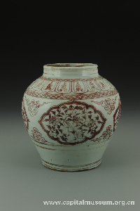 釉里红开光花鸟纹罐 元代 瓷 罐高25.4厘米,口径13.2厘米,底径15.2厘米 1980年高安县江西第二电机厂元代窖藏出土 高安市博物馆藏 釉里红是元代创烧的釉下彩瓷器品种,体现了中国古代科技在现实生活中的应用。釉里红用铜红料作为着色剂在瓷胎上绘画纹饰,再罩以透明釉,在高温下烧成,釉下呈现红色花纹。釉里红瓷器的烧造对窑内气氛要求很高,很不容易烧成纯正的红色。 此罐为多段衔接成型,腹部主体纹是在四个对称的菱花开光内的吉祥图案。开光图案极具民间剪纸艺术效果,线条细腻,代表了元代釉里红瓷烧造水平。 |