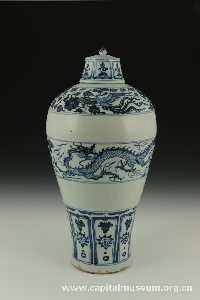 青花云龙纹带盖梅瓶(“書”字) 元代 瓷 通高47.7厘米,高44.1厘米,口径5.6厘米,腹径23.09厘米,底径13.5厘米 1980年高安县江西第二电机厂元代窖藏出土 高安市博物馆藏 梅瓶在宋代称为“经瓶”,宋、元、明时期为储酒器。清代为陈设器,可插一枝梅花,所以称为“梅瓶”。此梅瓶造型优美,肩部装饰鸾凤穿牡丹纹。鸾凤是元青花中流行的装饰题材,尾部向两侧卷曲的为鸾,条形散尾的为凤。 该梅瓶壁上一侧的墨书楷体“書”字与底足的墨书楷体“書”字相对应。高安元代窖藏出土了六件这样的梅瓶,分别以“六艺”(礼、乐、射、驭、书、数)做墨书记号。 |