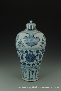 青花云肩牡丹纹带盖梅瓶 (“禮”字) 元代 瓷 通高48厘米,瓶高42厘米,腹径23.9厘米,口径6.4厘米,底径14厘米 1980年高安县江西第二电机厂元代窖藏出土 高安市博物馆藏 这件梅瓶采用了元代特有的多层装饰手法。从上到下有十层装饰。层与层之间,分别用卷草、菱形纹、弦纹、双弦纹相间。纹饰繁缛而不乱,主题突出而层次分明,绘画运笔粗中有细,显示出元青花成熟期产品绘画创作的时代特征。 该梅瓶一侧有墨书楷体“禮”字。瓶底由于年代久远,土壤侵蚀等诸多因素使墨书字体荡然无存。 |