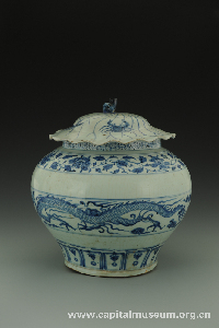 青花云龙纹荷叶盖罐 元代 瓷 通高36.8厘米,罐高29.3厘米,腹径35厘米,口径21.3厘米,底径20.2厘米 1980年高安县江西第二电机厂元代窖藏出土 高安市博物馆藏 荷叶盖罐是元青花特有的造型之一。盖为荷叶形,钮如同卷曲的莲杆。该罐纹饰构图疏朗,别出心裁,有别于众多元青花布局繁缛的特点。盖面的四向分别绘有鳜鱼、青鱼、鲶鱼及螃蟹一只,穿行嬉戏于叶脉之中。腹部主体纹饰绘两条相逐的云龙。 |