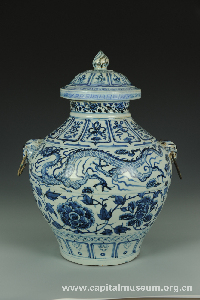 青花云龙纹兽耳盖罐 元代 瓷 通高46.5厘米,罐高38.7厘米,腹径32.6厘米,口径14.6厘米,底径18.5厘米 1980年高安县江西第二电机厂元代窖藏出土 高安市博物馆藏 该罐高大雄浑,表现出元青花装饰繁密的特点。纹饰从上到下多达十二层。肩部两侧各贴塑模印铺首一只,铺首口中各穿铜环。 这种带有铜环的瓷器在国内恐怕不多见,因为将铜环和瓷器扣合在一起需要很复杂的技术。 |