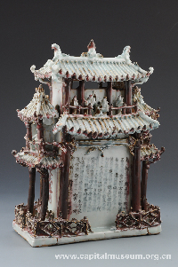 青花釉里红堆塑楼阁式人物谷仓(3件) 元代 瓷 纵10.3厘米,横20厘米,高29厘米,重3.27千克 1979年江西省文物工作队发掘 江西省博物馆藏 这件器物为墓主人储存粮食之用,由上、下两层和中间的活动式仓门组成,可拆卸,造型复杂,烧制难度高。四周门廊上有堆塑人物十八个,包括舞蹈、奏乐、仕女、侍卫俑等,有的怀抱琵琶,有的吹箫弄笛,有的甩袖起舞,姿态各异,活灵活现。正面中间为红色活动式插板仓门,两旁为白地青料楷书七言对联。背面底层正中有正楷直书白地蓝字墓记一方。 这是目前仅见的有确切纪年的青花釉里红瓷器,具有极高的研究价值。2002年初,国家文物局发布了《首批禁止出国(境)展览文物目录》,其中64件(组)一级文物禁止出国(境)展出,这件元代纪年青花釉里红楼阁式谷仓便是其中一件。 |