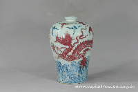 青花釉里红云龙纹梅瓶 明永乐 瓷 高34厘米,口径6.7厘米,足径16厘米 2003年景德镇市珠山御窑遗址出土 景德镇市陶瓷考古所暨御窑博物馆藏 这件梅瓶用釉里红绘出一条行龙飞腾于波涛汹涌的蓝色大海之中。山峰挺立,波涛澎湃,红蓝相间,别具一格。这是一件落选的永乐官窑瓷器。明代御器厂烧造的瓷器在运往京城之前需要先进行筛选,瑕疵品和贡余品要打碎掩埋,不能流入民间。正因如此,经过考古人员的发掘、复原,我们今天才得以看到这件未能上贡的瑕疵品。 |