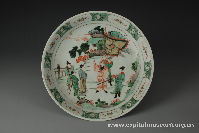 五彩人物故事纹盘 清康熙 瓷 高5.6厘米,口径35.2厘米,底径19.9厘米 江西省博物馆藏 五彩瓷最早烧造于元代,但不为人们所欣赏。明嘉靖、万历时期开始流行,所烧五彩多为青花五彩,也有的在白釉地上直接以红、绿、黄、赭、紫等色彩绘画,然后在低温下二次烧成。康熙时期五彩瓷的烧造再次达到高峰,外销瓷中五彩瓷的比重大大提高,受到欧洲人和日本人青睐。五彩瓷画面艳丽,非常符合西洋人审美需求,但他们并不是用五彩瓷盛放食物,而是挂在墙上做装饰品。 这件盘的盘心绘一组戏曲人物故事图案。画面开阔,绘画细腻,层次感较强,釉面润泽,为康熙时期的民窑佳器。 |