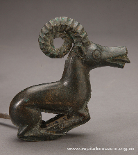 铜独角卧羊 汉(公元前206年―公元220年) 立耳,双目圆睁,似猪鼻,嘴部夸张突出,微启露出舌头,独角卷曲成漩涡状,无尾,前腿弯曲,后腿前伸,相交互熔铸在一起。羊的特征鲜明写实,与后期的獬豸有明显区别。 在《后汉书》、《论衡》等古代著作中,认为评判公正的神兽——獬豸的原型是一独角羊。随着人们认识的不断丰富,獬豸也像龙一样,在独角羊的原型中拼凑了多种动物的特征,成为了各种动物的综合体。 |