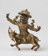 骑羊护法 清(公元1616年—1911年) 高15厘米,臂长12厘米,厚4厘米 “骑羊护法”是西藏佛教特有的神祗。他的藏名叫“唐坚噶瓦那波”,汉名叫“守哲黑铁匠神”。头戴笠帽,三目圆睁,内穿右衽交领式长袍,脚上着靴,骑在一头曲角长鬃的红山羊身上.右手高举着铁锥,左手拿一具虎皮风箱。这是铁匠的工具也是他护法的武器,而那头大山羊是他生命的依附之处。 |