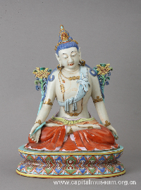 粉彩观音菩萨像 清(公元1616年—1911年) 由发髻上的阿弥陀佛,可知是一尊观音菩萨像。面容端庄,双目下视,神态甚是安详,双手下垂结印,各持一莲茎,莲花从双肩伸出开放,上身只披一件羚羊皮,下身穿红色僧裤,整体色彩鲜艳。 藏传佛教中融入了藏族地区的原始宗教——苯教,苯教经典《符音释难》载:“穆叶十八神即马神红、公牦牛神猛、奶牛神逊、绵羊神敏、山羊神凶;虎神等”,可见,羊与藏族先民原始信仰的密切关系。至今,藏族还保留着“放生羊”的习俗。挑选一些健康的羊,身上系着五彩织物,不能宰杀,不能鞭挞,尤其自生自灭,供神灵享用。 |