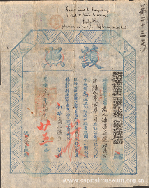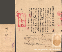 1947年驻新加坡中华总领事发给郑潮炯的中西文证书 展品年代:1947年 展品尺寸: (闭)27.5*20.2(开)40.3*27.5 抗战胜利后,郑潮炯先生再次背起布袋义卖瓜子,该文物为新加坡总领事馆发给郑潮炯先生的证明书,以便利其在南洋的义卖活动。 |