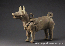 绿釉红陶狗 东汉 (25年—220年) 长55厘米,高42厘米,宽14厘米 丰台区黄土岗公社二台子汉墓出土 这只陶狗为红陶质地,站立姿态。它四肢有力,肌体壮硕,口部微张,尾巴上卷,双目圆瞪,向前注视,双耳耸立,呈现出一幅警觉、忠诚的神态。狗颈与胸之间有系带,并连接着链环,用以装饰或者供人牵制。 |