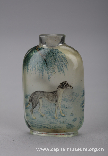 内画骏犬图鼻烟壶 清(1644年—1911年) 高6厘米,宽3厘米 内画鼻烟壶是我国自清代逐渐发展起来的传统手工技艺。画者通过一种特制的小竹笔从壶口伸入壶体内侧,反向在壶壁上作画。画面的内容包罗万象、雅俗共赏。这个内画犬鼻烟壶用色清丽雅致,笔触细腻精确,以垂柳和猎犬构成了画面的主要内容,画风颇有清代宫廷画犬的风格。虽然此鼻烟壶未见作者名款,仍不失为内画鼻烟壶之佳作。 |
