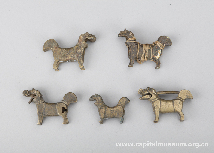犬形铜锁 民国(1912年—1949年) 长7厘米,高4厘米 铜锁造型生动写实,狗腿短小结实,着地平稳,锁芯前梁隐于狗颅内引出,从后颈直达尾尖,狗尾呈双片夹梁形制,设计巧妙且安全性能较高。人们将锁做成狗形取“犬守平安”的吉祥寓意,也是自古以来狗在人们心中忠诚护院的生动写照。 |