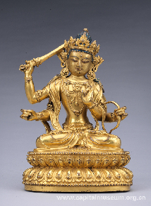 铜鎏金四臂文殊菩萨像 明 高22厘米,宽15厘米 西藏博物馆藏 |